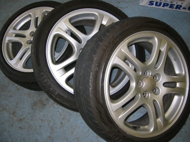 JDM Legacy B4 17"x7" 5x100 bolt pattern rims with JDM Dunlop FM701 tires, will clear Subaru 4pot brakes.